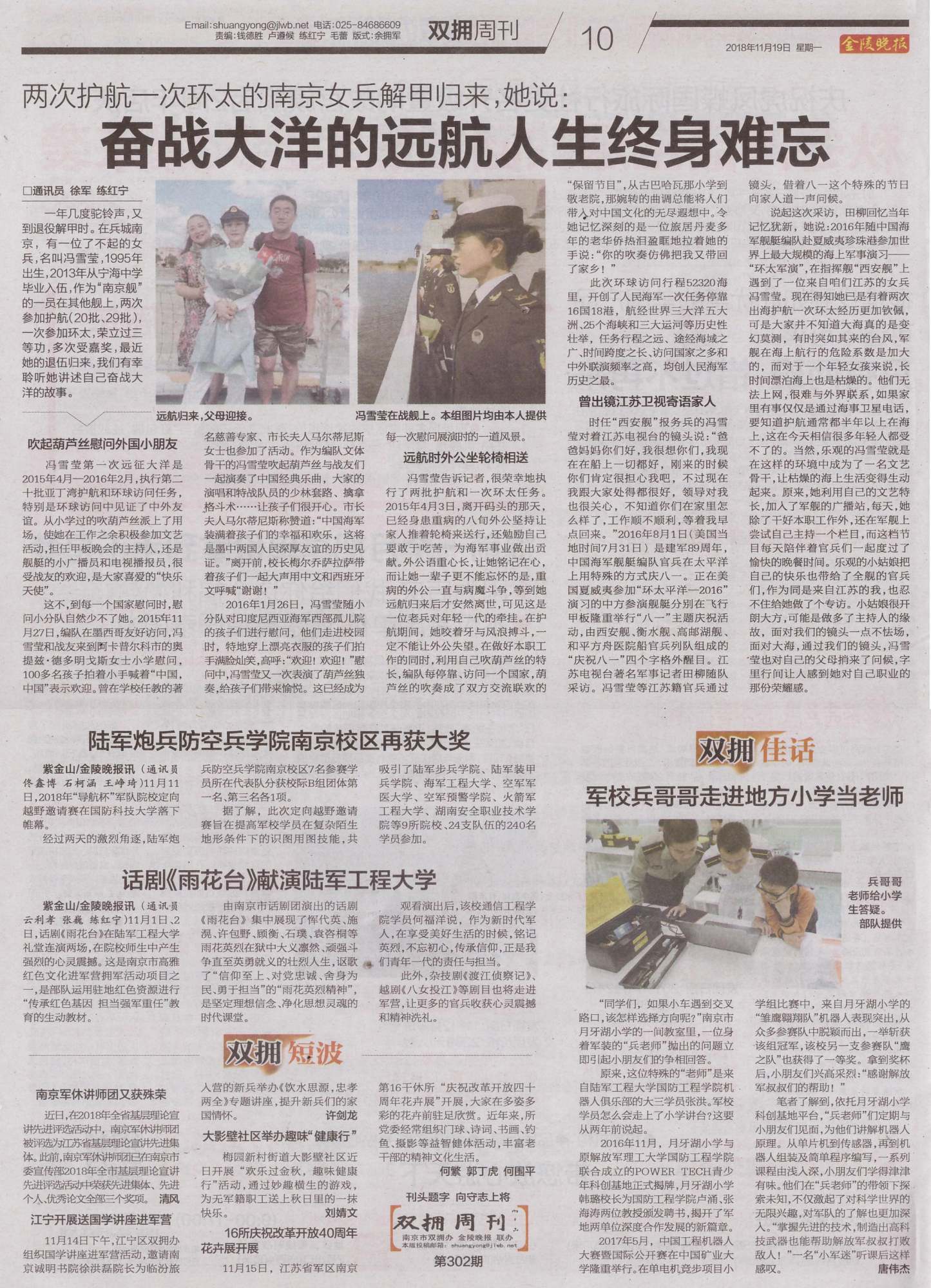 说起这次采访,田柳回忆当年记忆犹新,她说:2016年随中国海军舰艇编队赴夏威夷珍珠港参加世界上最大规模的海上军事演习——“环太军演”,在指挥舰“西安舰”上遇到了一位来自咱们江苏的女兵冯雪莹。现在得知她已是有着两次出海护航一次环太经历更加钦佩,可是大家并不知道大海真的是变幻莫测,有时突如其来的台风,军舰在海上航行的危险系数是加大的,而对于一个年轻女孩来说,长时间漂泊海上也是枯燥的。他们无法上网,很难与外界联系,如果家里有事仅仅是通过海事卫星电话,要知道护航通常都半年以上在海上,这在今天相信很多年轻人都受不了的。当然,乐观的冯雪莹就是在这样的环境中成为了一名文艺骨干,让枯燥的海上生活变得生动起来。原来,她利用自己的文艺特长,加入了军舰的广播站,每天,她除了干好本职工作外,还在军舰上尝试自己主持一个栏目,而这档节目每天陪伴着官兵们一起度过了愉快的晚餐时间。乐观的小姑娘把自己的快乐也带给了全舰的官兵们,作为同是来自江苏的我,也忍不住给她做了个专访。小姑娘很开朗大方,可能是做多了主持人的缘故,面对我们的镜头一点不怯场,面对大海,通过我们的镜头,冯雪莹也对自己的父母捎来了问候,字里行间让人感到她对自己职业的那份荣耀感。(原载《金陵晚报 双拥周刊》2018年11月19日)