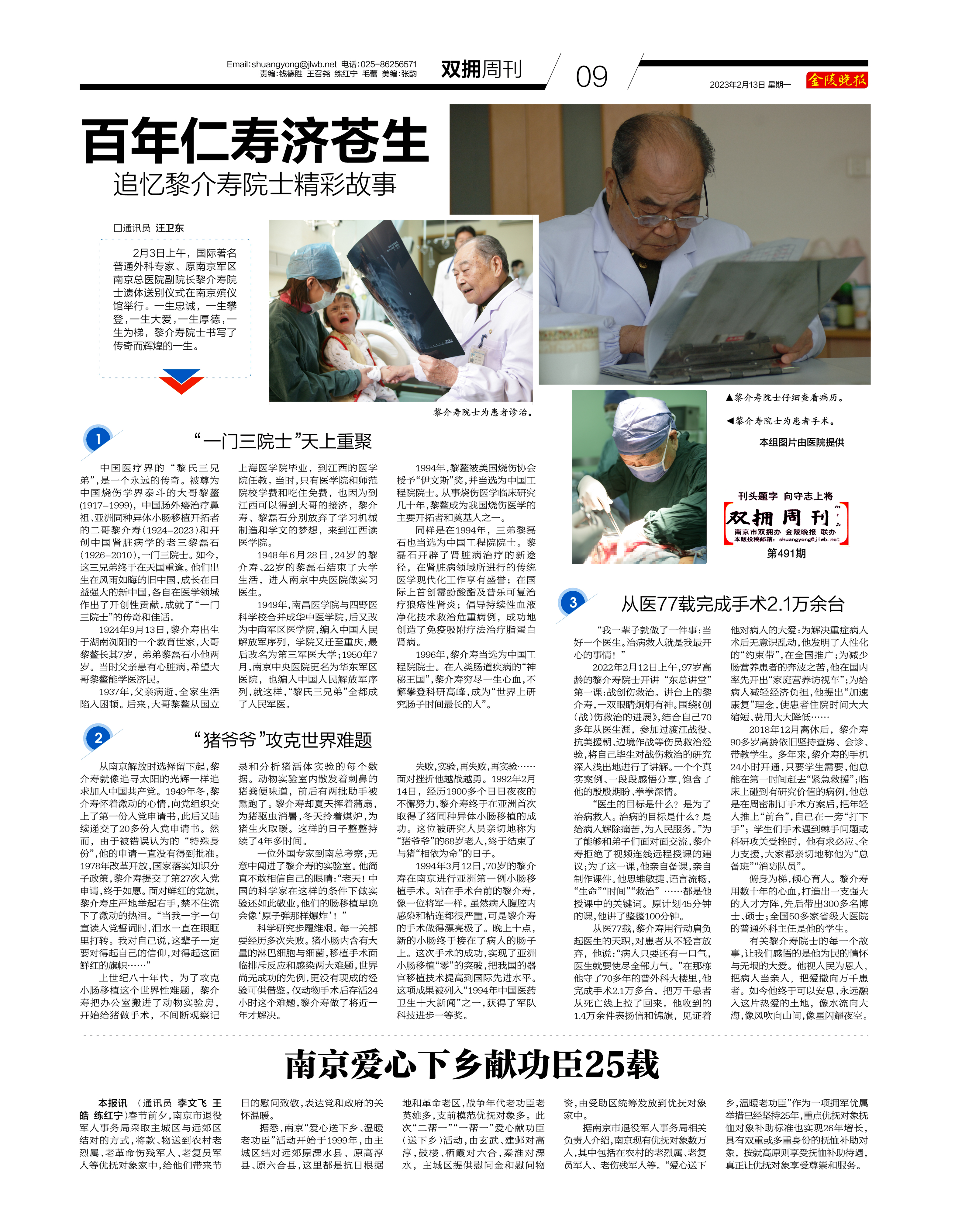 有关黎介寿院士的每一个故事,让我们感悟的是他为民的情怀与无垠的大爱。他视人民为恩人,把病人当亲人,把爱撒向万千患者。如今他终于可以安息,永远融入这片热爱的土地,像水流向大海,像风吹向山间,像星闪耀夜空。(原载《金陵晚报双拥周刊》2023年2月13日)