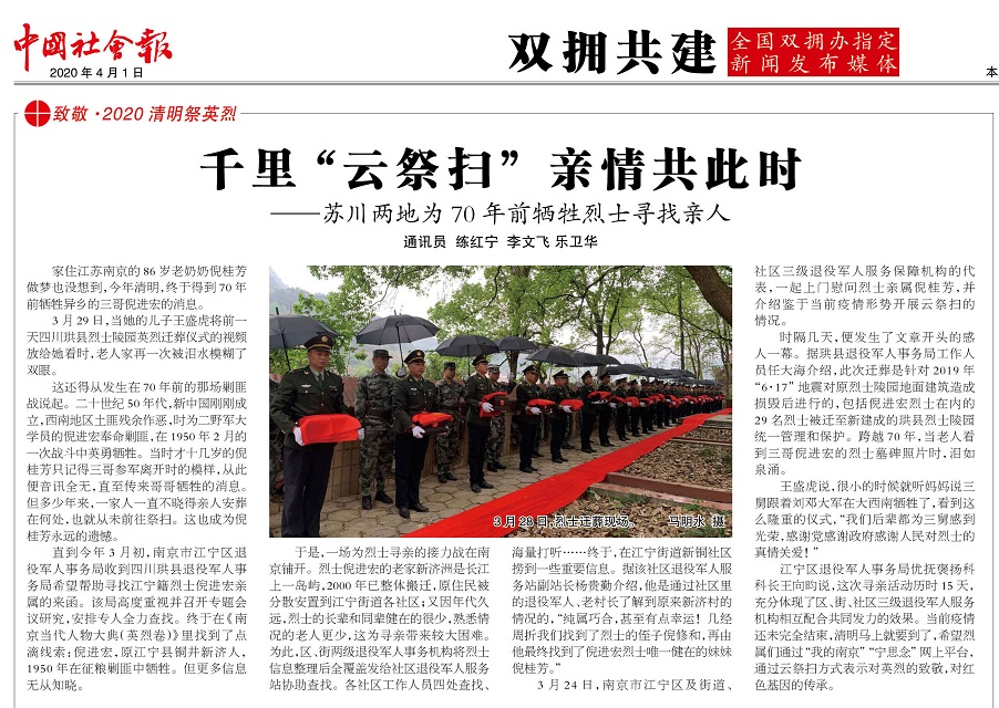 江宁区退役军人事务局优抚褒扬科科长王向昀说,这次寻亲活动历时15天,充分体现了区、街、社区三级退役军人服务机构相互配合共同发力的效果。当前疫情还未完全结束,清明马上就要到了,希望烈属们通过“我的南京”“宁思念”网上平台,通过云祭扫方式表示对英烈的致敬,对红色基因的传承。(原载《中国社会报》2020年4月1日)