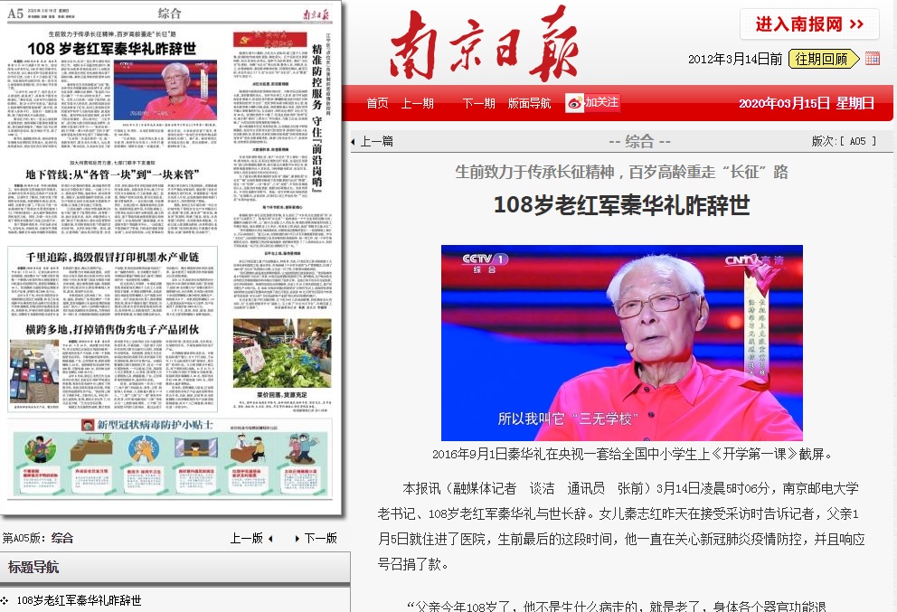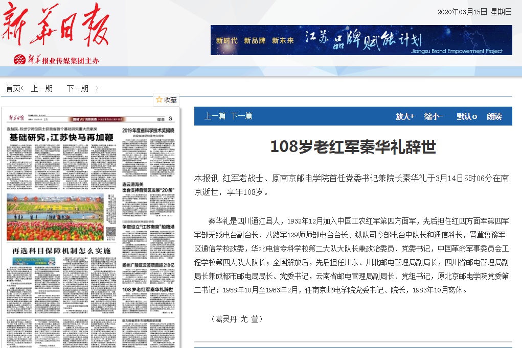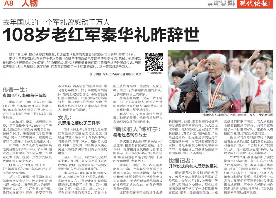 本报讯(融媒体记者 谈洁 通讯员 张前)3月14日凌晨5时06分,南京邮电大学老书记、108岁老红军秦华礼与世长辞。女儿秦志红昨天在接受采访时告诉记者,父亲1月5日就住进了医院,生前最后的这段时间,他一直在关心新冠肺炎疫情防控,并且响应号召捐了款。