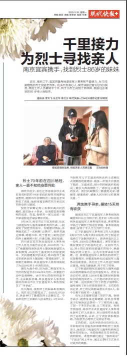 近日,南京江宁、宜宾珙县两地退役军人事务局千里接力,为70年前牺牲的烈士倪进宏寻亲。功夫不负有心人,现代快报记者3月29日获悉,两地工作人员辗转半个月,终于为烈士找到了亲妹妹,现居住在南京的86 岁老人倪桂芳。