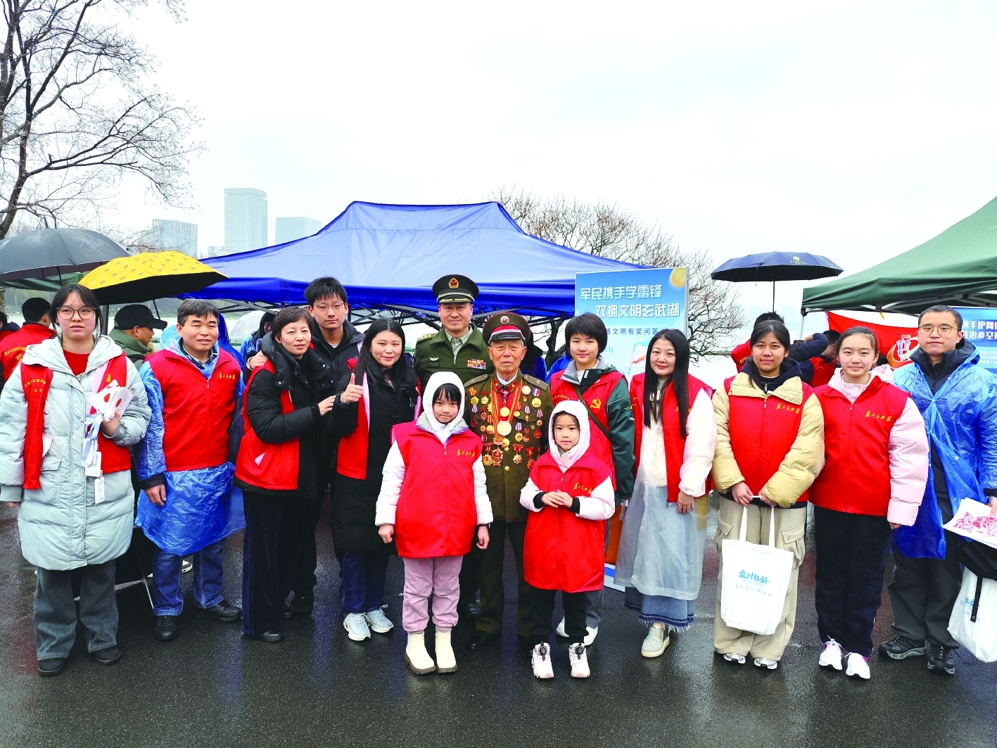 三月的玄武湖,春雨淅沥,却挡不住向善的脚步、温暖的传递。3月1日,第63个学雷锋纪念日前夕,南京市双拥办联合陆军工程大学野战工程学院、南京警备区政治工作处、共青团南京市委社会联络部、玄武湖公园管理处,在春雨淅沥的玄武湖畔举办第四届“军民携手学雷锋、双拥文明玄武湖”主题文明实践活动。南京军地500余名来自部队、机关、医院、高校及中小学的志愿者冒雨参与,交出新时代传承雷锋精神的暖心答卷。