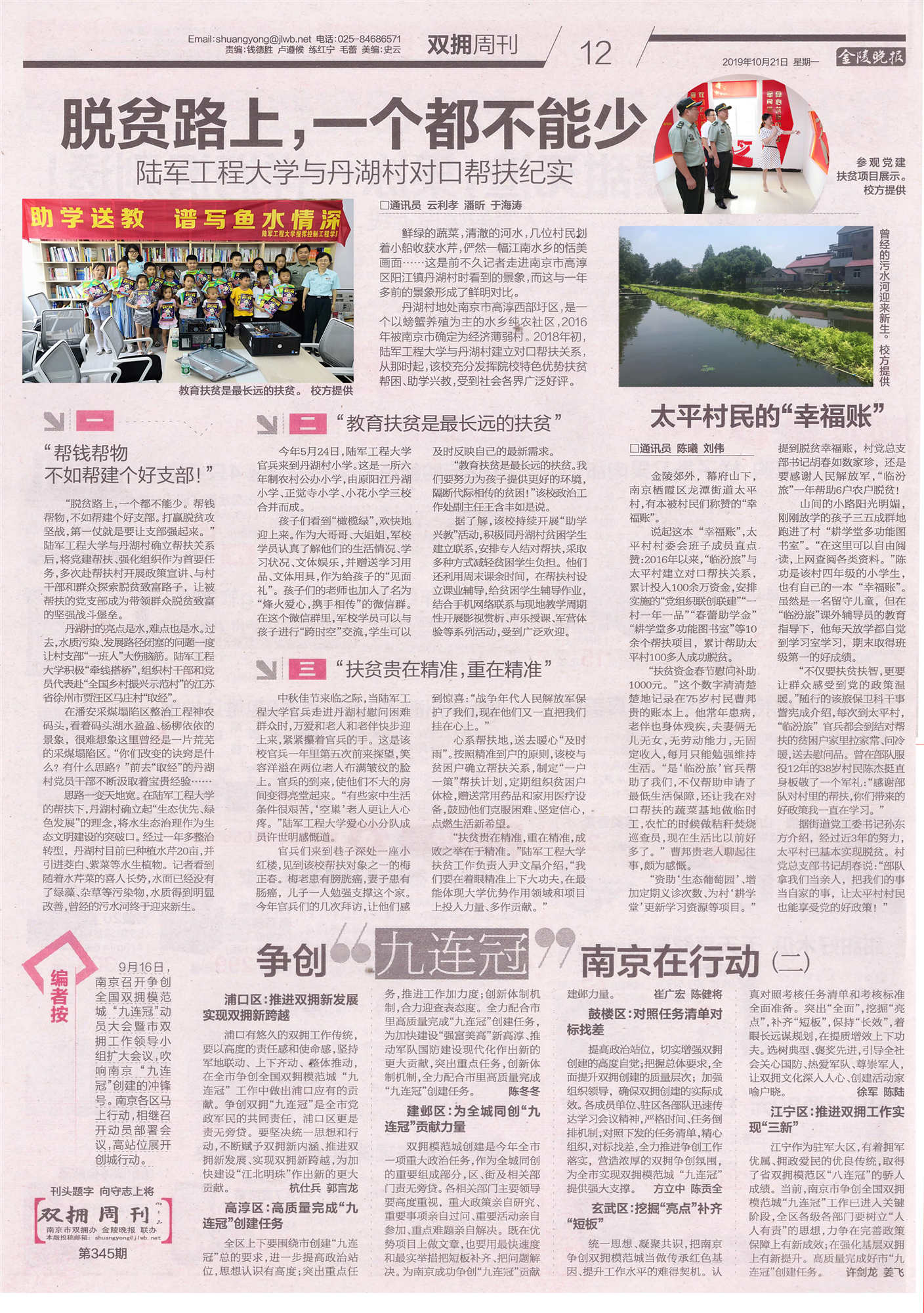 “扶贫贵在精准,重在精准,成败之举在于精准。”陆军工程大学扶贫工作负责人尹文晶介绍,“我们要在着眼精准上下大功夫,在最能体现大学优势作用领域和项目上投入力量、多作贡献。”(原载《金陵晚报双拥周刊》2019年10月21日)