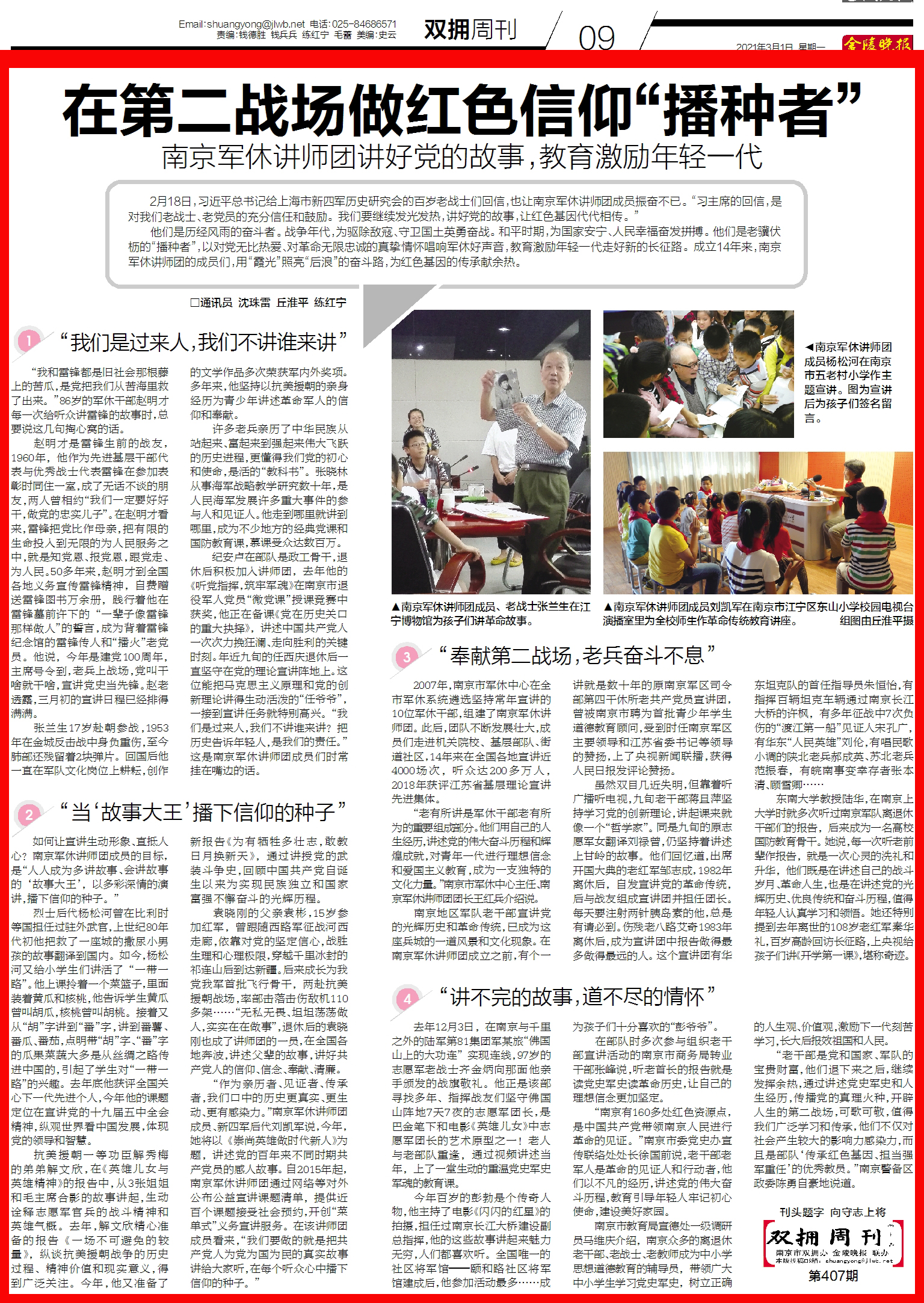 “老干部是党和国家、军队的宝贵财富,他们退下来之后,继续发挥余热,通过讲述党史军史和人生经历,传播党的真理火种,开辟人生的第二战场,可歌可敬,值得我们广泛学习和传承,他们不仅对社会产生较大的影响力感染力,而且是部队‘传承红色基因、担当强军重任’的优秀教员。”南京警备区政委陈勇自豪地说道。(原载《金陵晚报双拥周刊》2021年3月1日)