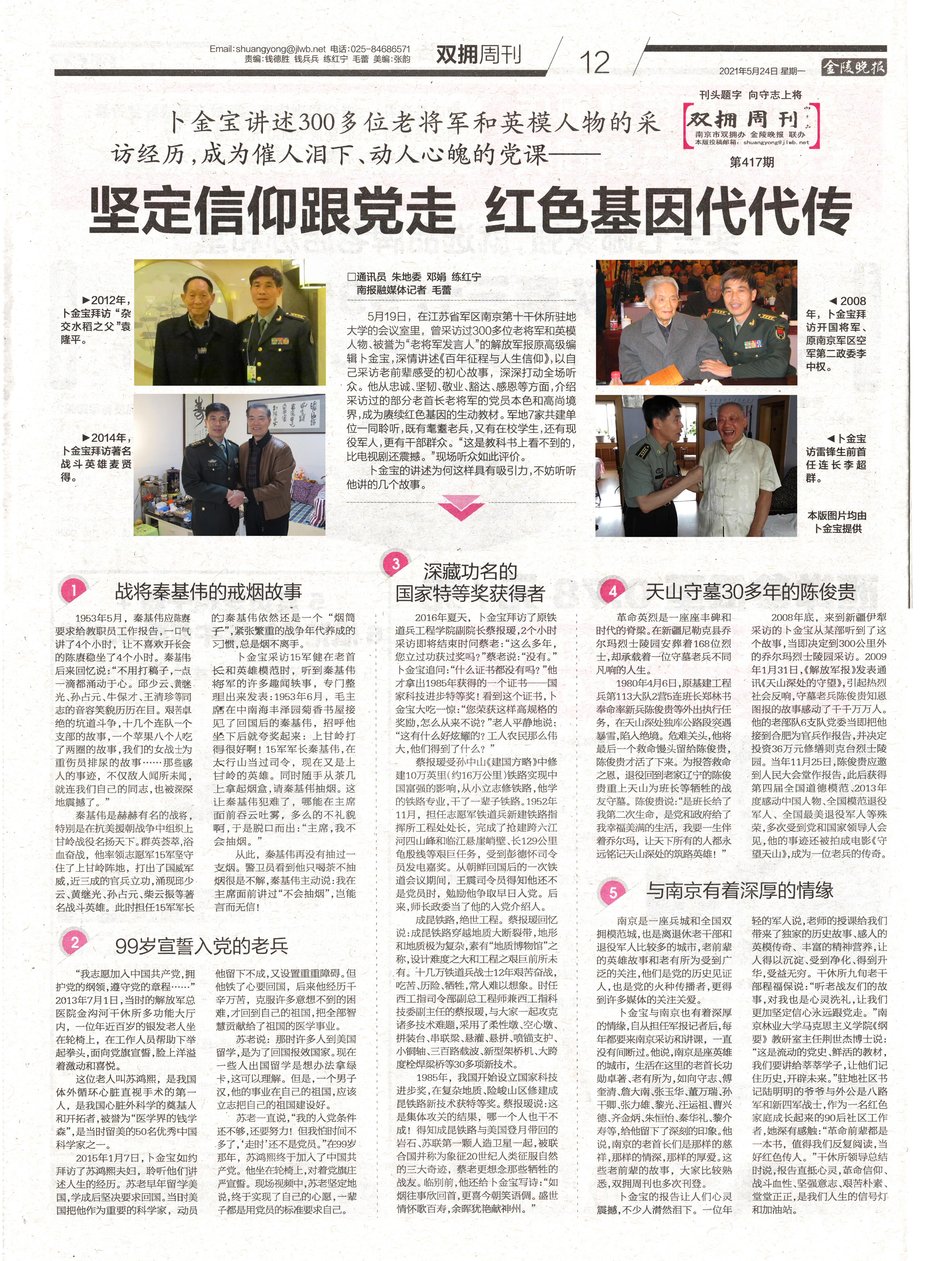 卜金宝与南京也有着深厚的情缘,自从担任军报记者后,每年都要来南京采访和讲课,一直没有间断过。他说,南京是座英雄的城市,生活在这里的老首长功勋卓著、老有所为,如向守志、傅奎清、詹大南、张玉华、董万瑞、孙干卿、张力雄、黎光、汪运祖、曹兴德、齐金炳、朱恒怡、秦华礼、黎介寿等,给他留下了深刻的印象。他说,南京的老首长们是那样的慈祥,那样的情深,那样的厚爱。这些老前辈的故事,大家比较熟悉,双拥周刊也多次刊登。