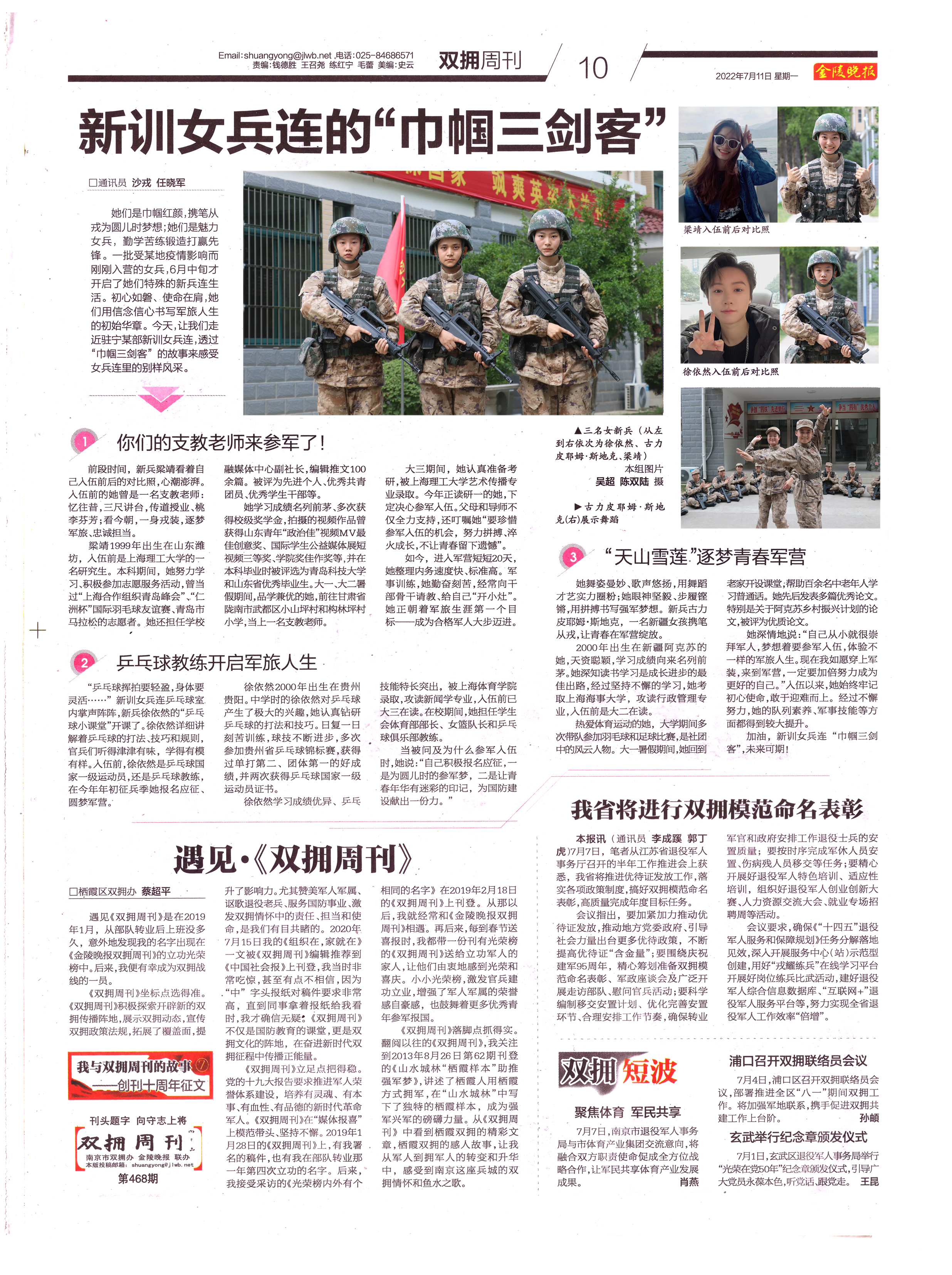 《双拥周刊》落脚点抓得实。翻阅以往的《双拥周刊》,我关注到2013年8月26日第62期刊登的《山水城林“栖霞样本”助推强军梦》,讲述了栖霞人用栖霞方式拥军,在“山水城林”中写下了独特的栖霞样本,成为强军兴军的磅礴力量。从《双拥周刊》 中看到栖霞双拥的精彩文章,栖霞双拥的感人故事,让我从军人到拥军人的转变和升华中,感受到南京这座兵城的双拥情怀和鱼水之歌。(原载《金陵晚报双拥周刊》2022年7月11日)
